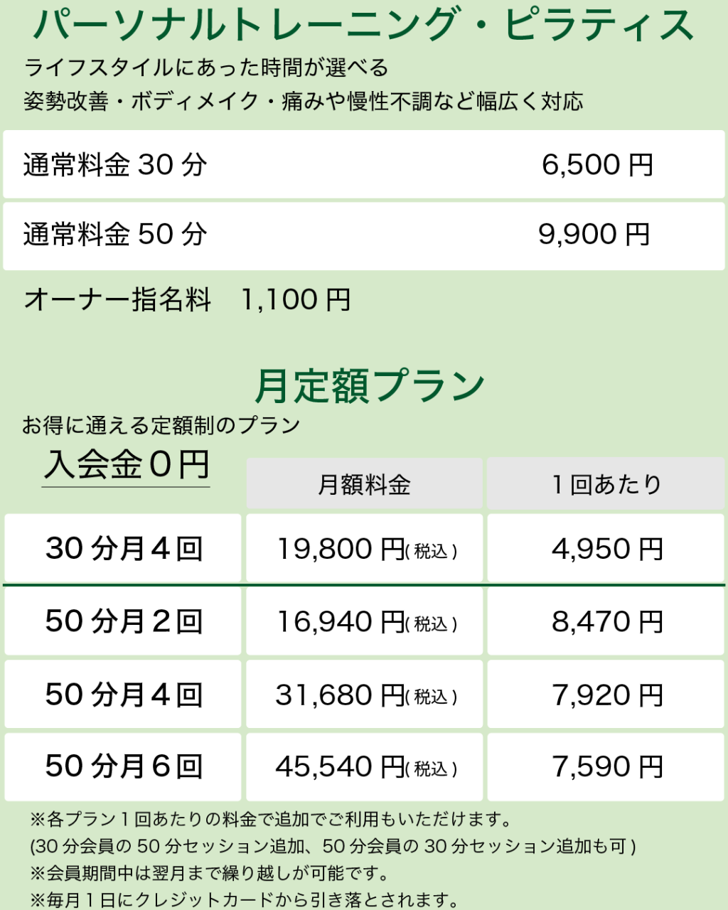 - トレーニングのみでもご利用可能です!他にもピラティス、整体やカッピングなどの施術も受けられますし、もちろん整体のみのご利用もOKです。